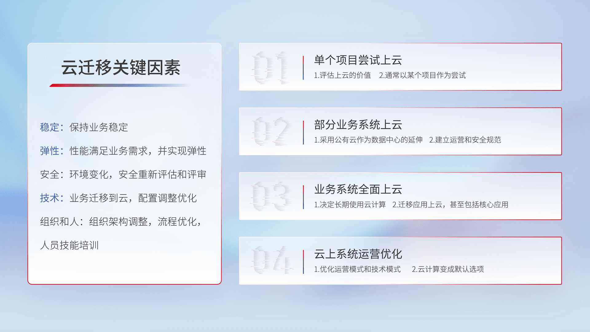 结合实际业务,,从规划设计、、、云平台选型、、、、云原生改造、、数据迁移、、、集成交付,,迁移全过程为客户识别最佳上云路径,,,做好风险识别管理,,设计网络架构、、、、身份权限、、、、安全审计合规、、、、操作审计、、、日志审计、、、监控告警策略、、、、多站点容灾设计等,,,对云上基础设施进行整体规划,,,提升IT治理水平,,以满足弹性、、、高可用、、、高性能的需求。。