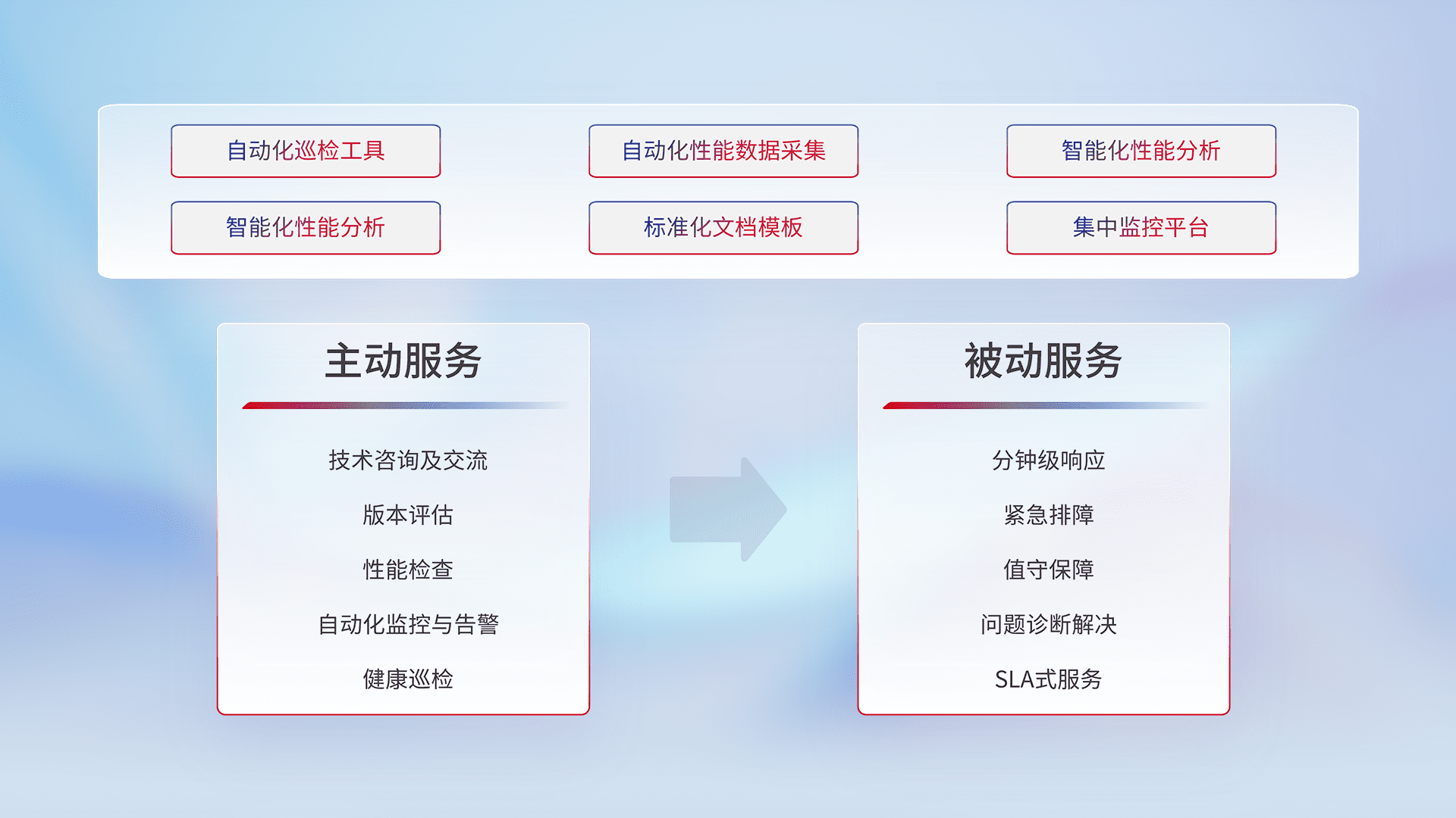 智能化工具和标准化文档,,,保障服务质量,,,,提供主动服务(包含技术咨询、、版本评估、、、性能检查、、自动化监控与告警、、、健康巡检)和被动服务包含(分钟级响应、、、紧急排障、、、、值守保障、、问题诊断解决、、、SLA服务)。。。。